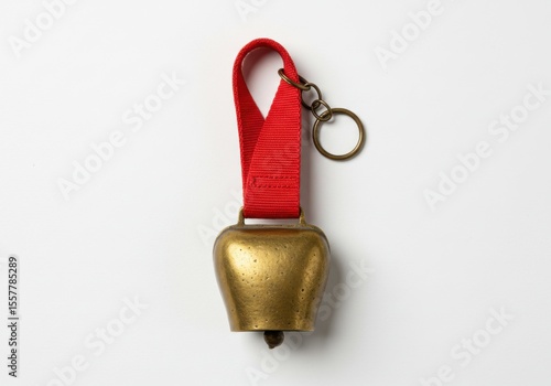 Antique brass cowbell keychain with red ribbon and metal ring