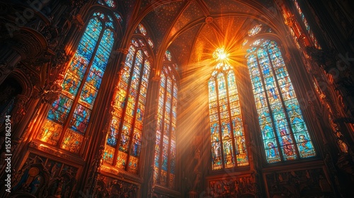 sunlight pours through stained glass windows in majestic catholic cathedral, casting vibrant reflections on stone floor, enhancing serene and reverent atmosphere