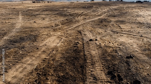 Tire tracks crisscross a barren, dusty landscape under a pale sky. The deep ruts suggest heavy vehicles recently passed