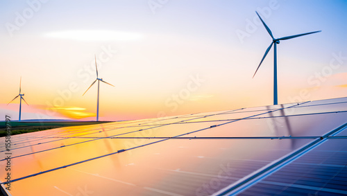 Sustainable Future: Solar Panels and Wind Turbines at Sunset for Clean Energy