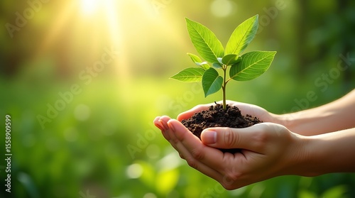 A hyper realistic image captures hands embracing a robust green tree and a fragile young plant, expressing environmental stewardship and Earth Day.