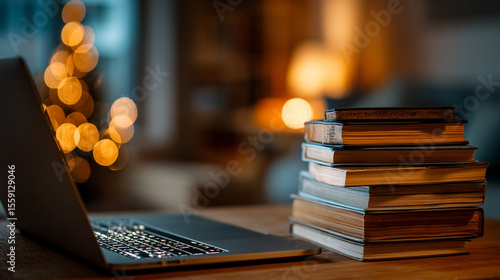 Warm lights illuminate a modern laptop beside a timeless stack of books, creating a perfect study ambiance.
