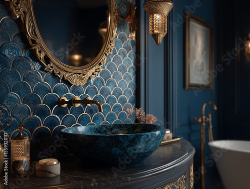 Elegancka łazienka w odcieniach głębokiego granatu i złota. Ozdobne lustro, umywalka z kamienia, kunsztowne lampy tworzą luksusową atmosferę.