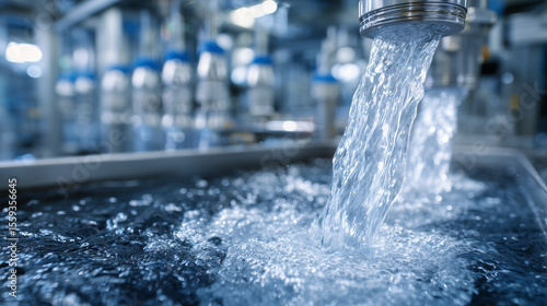 Crystal-clear water flowing from a filtration system into transparent bottles, emphasizing clean technology and liquid purity, with sleek aqua tech instruments in the background