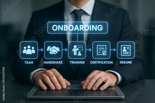 Professional hands interact with a glowing digital interface illustrating the essential steps of a modern employee onboarding process.