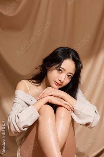 ベージュの布地背景で撮影をした若い女性の高級感のある美容ポートレート