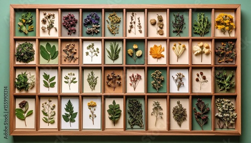 Modern herbarium board displaying scanned flora samples with text overlays on soft textured paper and green tonal palette
