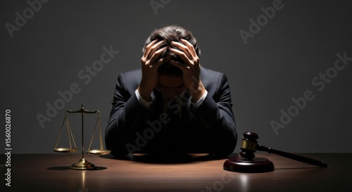 A person in a suit in despair after losing a legal case, with their head in their hands at a desk with a gavel and scales of justice.