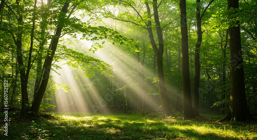 緑豊かな森に差し込む神秘的な光線 自然の美しさと静寂を感じる癒しの風景