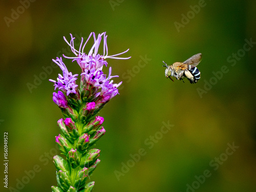 Blue Banded Bee in flight with pollen already on legs head to the top of a Pink Liatris flower which is in flower and in bud.