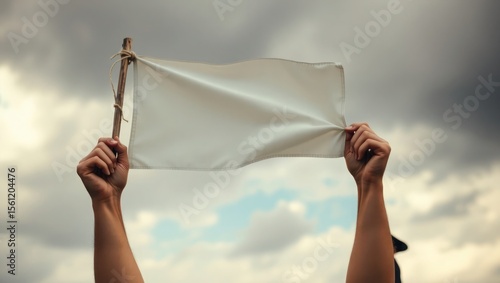 Hands holding a blank white flag aloft against a cloudy sky, symbolizing surrender or peace.