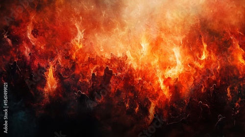 Inferno: A fiery abstract artwork depicting a chaotic inferno, showcasing intense flames, and dark figures engulfed in the blaze. The piece evokes feelings of destruction and chaos.