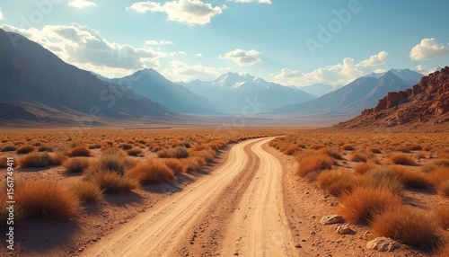 Dirt road winds through desert landscape. Mountains on background. Road trip adventure through scenic valley. Sunny day, blue sky. Hiking, travel. American Southwest, Utah, Arizona. Valley view, road