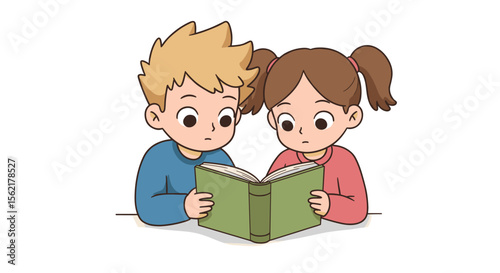 Children reading a book together vector illustration in cute cartoon style for educational designs