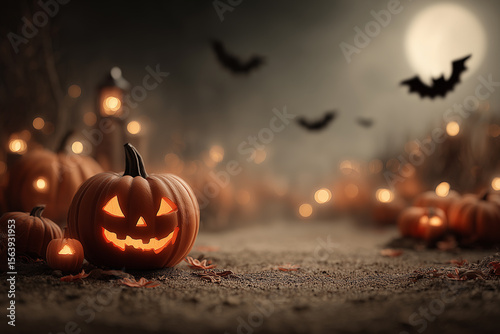 Upiorna dynia Jack-o'-lantern z świecącym uśmiechem w centrum, otoczona rozmazanymi światłami, nietoperzami i księżycem. Idealne tło na Halloween.
