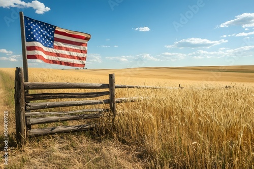 American flag waves gently over vintage flag and rural America beside wooden fence and wheat field in countryside landscape