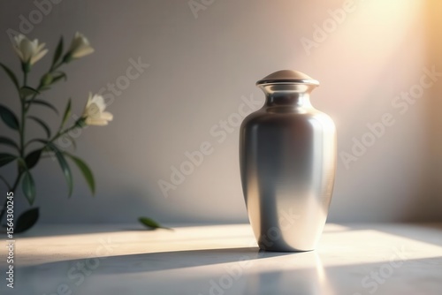 Modern memorial space, metallic cremation urn in soft light , shine, solemn