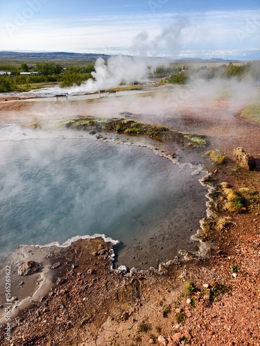 Blue geothermal pool in colorful volcanic landscape in Iceland