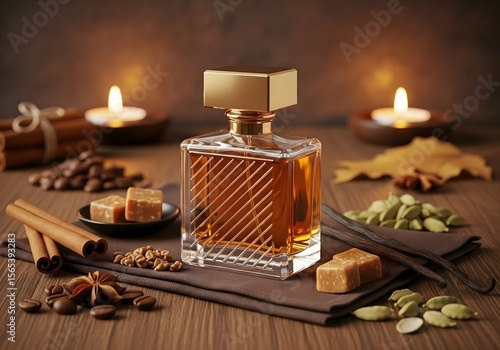 Perfume bottle with golden cap surrounded by aromatic spices and candles, evoking a warm and luxurious scent experience