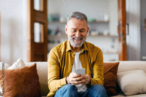 Senior man using smartphone texting, networking in social media or scrolling social media, sitting on sofa at home. Gadgets and retirement lifestyle