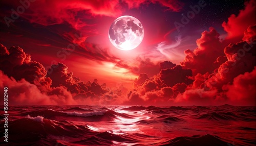 真っ赤に染まる月夜と波打つ雲