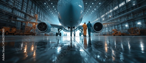 Technicians performing aircraft maintenance examine the fuselage of an aircraft in the hangar.