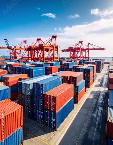Shipping containers stacked at busy seaport terminal with cranes loading cargo