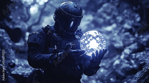 Futuristic Soldier Holding Glowing Sphere in Dark Cavern Scene
