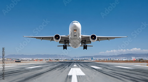 Commercial airplane taking off from an airport runway, front view, with a clear blue sky in the background.
