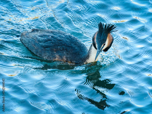 Australasian crested grebe swimming in Lake Wakatipu. Queenstown. South Island.
