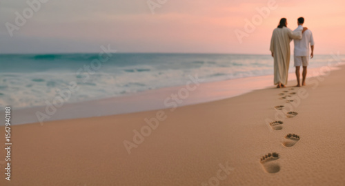 Footprints on the Beach with Jesus and a Man Walking Side by Side