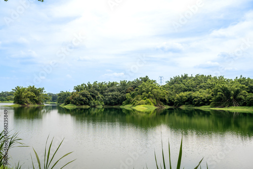 Tranquil morning view across Lantan Reservoir’s glassy water, lush tree-lined banks and soft summer sky reflecting the serene beauty of this popular scenic lake and recreation area.