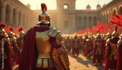 Back view of Roman centurion leading army formation with golden armor, red cape. Soldiers in full military gear march in ancient Roman courtyard with flags. Historical reenactment legionary power.