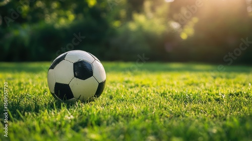 #709919972A soccer ball rests on a lush green field, bathed in the warm glow of sunlight.