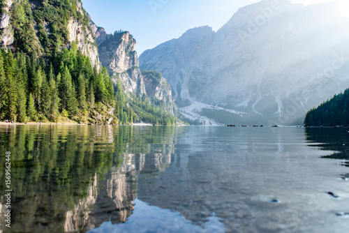 Idyllic view of Lago di Braies in South Tyrol, Italy. A tranquil path follows the shore, surrounded by towering pines and the grandeur of the Dolomite peaks. Pure natural beauty.