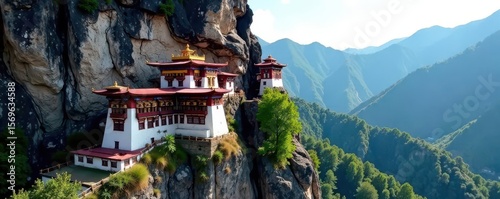 Ancient monasteries clinging to rugged Bhutanese slopes, lush valleys below, culture, ancient