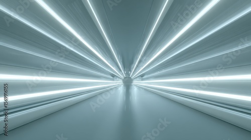 Futuristic tunnel with white glowing light beams converging to a central vanishing point in minimal monochrome space ideal for sci-fi backgrounds and tech concept visuals