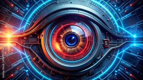 A futuristic cybernetic eye with glowing blue and red neon circuits