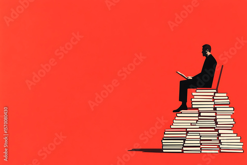 The reader sits upon stacked books, engrossed in his reading. He is the king of the books and the world of knowledge.