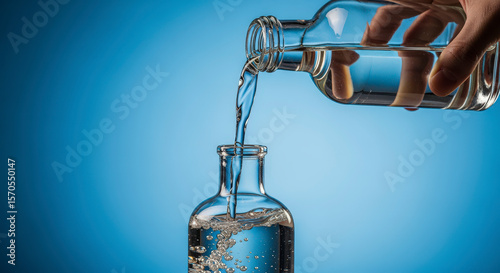 Clear Water Pouring From One Glass Bottle To Another Against Blue Background