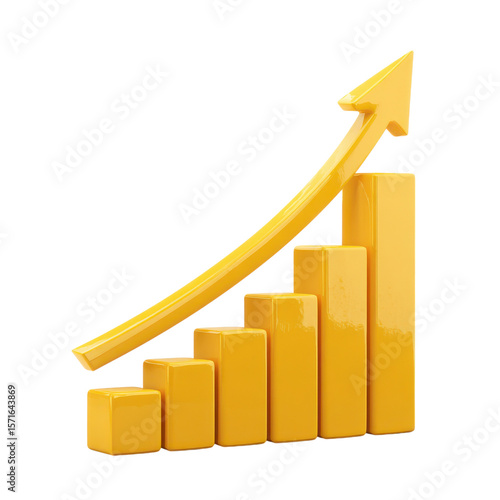 Transparent PNG available 3D yellow bar graph illustration with an upward-pointing arrow, representing growth, success, or improvement. Perfect for business or statistical