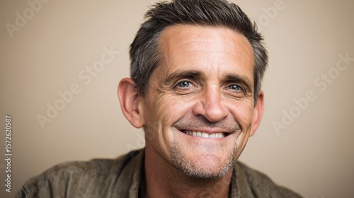 Smiling middle-aged man with grey hair, warm natural light; a portrait of confidence and approachability