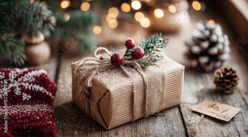 Gift wrapped in brown paper with twine and pine cone decorations on a wooden surface.