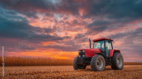 Red tractor parked in harvested cornfield under vibrant sunset sky, symbolizing autumn farming season and rural life in vivid natural light.