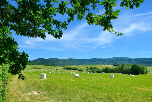 Summer scenic in Low Beskids (Beskid Niski). Haylage bales wrapped in white foil at a green meadow. Food for farm animals during the winter. Mountain range a Magura Watkowska in the background.