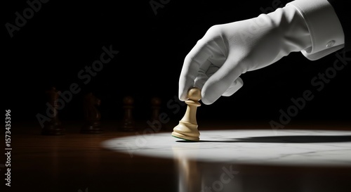 A gloved hand moves a white chess queen on a marble surface, with other pieces blurred in the background.
