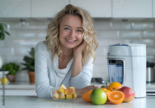 Młoda kobieta w kuchni z sokowirówką i owocami – zdrowe odżywianie, styl życia, uśmiech i świeże produkty