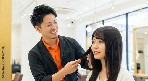 美容師とヘアスタイルを相談する女性
