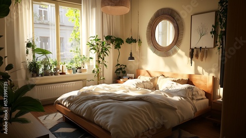 Cozy couples bedroom designed in warm tones with a wooden bed frame soft linens a decorative wall mirror plants by the windowsill and a calming ambiance perfect for relaxation