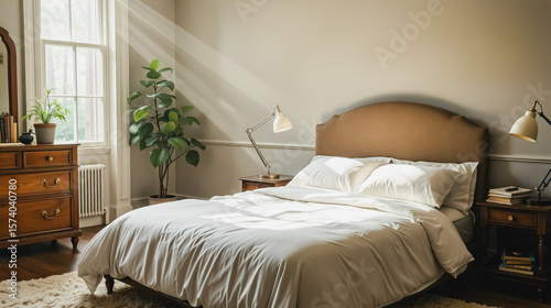 Cozy Bedroom Retreat with Natural Light, A beautifully styled and peaceful bedroom featuring a large bed with crisp white linens and a warm brown headboard. The room includes a dresser.